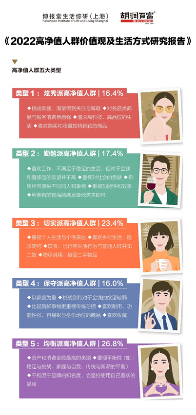 8、为深入了解高净值人群的差异性,项目组把高净值人群分为以下五类详细地展示每个人群的特征、价值倾向、生活观及消费行为。