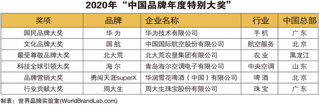 为了更多挖掘品牌在一年中的业绩表现,并对品牌特质进行深度把握,本届大奖依据行业及企业特点设立了“中国品牌年度特别大奖”。华为荣获“2020年国民品牌大奖”;国航荣获“2020年文化品牌大奖”;北大荒荣获“2020年最受尊敬品牌大奖”;海尔中央空调荣获“2020年科技全球引领大奖”;华润雪花勇闯天涯superX荣获“2020年品牌营销大奖”;周大生荣获“2020年行业贡献大奖”。值得一提的是,今年首次推出中国公益、中国国潮和绿色创新十大影响力品牌,以此褒奖以实际行动践行社会责任,坚持绿色发展,坚定不移的走可持续发展道路的优秀品牌。李宁、周大福荟馆JEWELRIA等品牌荣膺入榜。既保证了奖项的全面性,也使榜单有了独特视角。据悉,年度大奖调查对象涉及100多个行业的近3000个品牌的消费偏好。